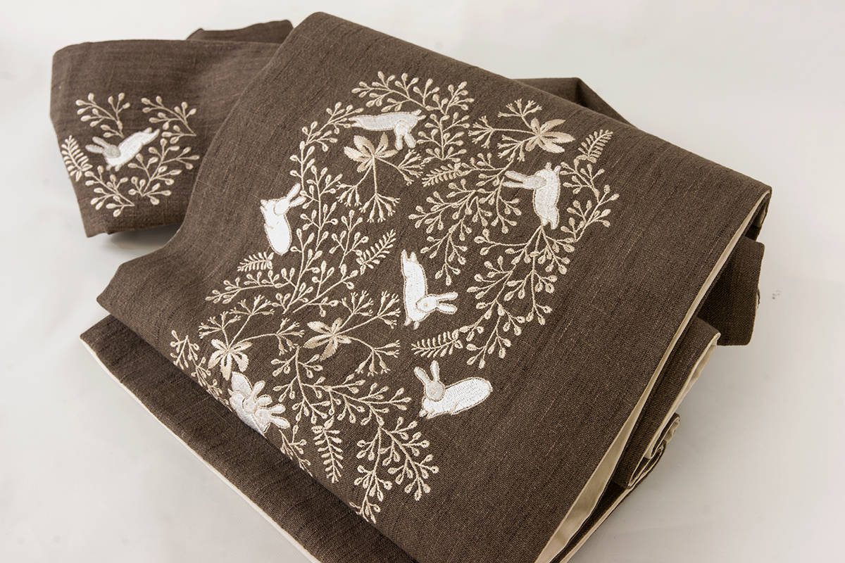 | 刺繍帯 小ロットのため、店内で一点一点製作しています。 スウェーデンのミシン “ハスクバーナ バイキング”を使用。 国産メーカーのミシンと比べてふっくらとしたやさしい仕上がりになります。 |