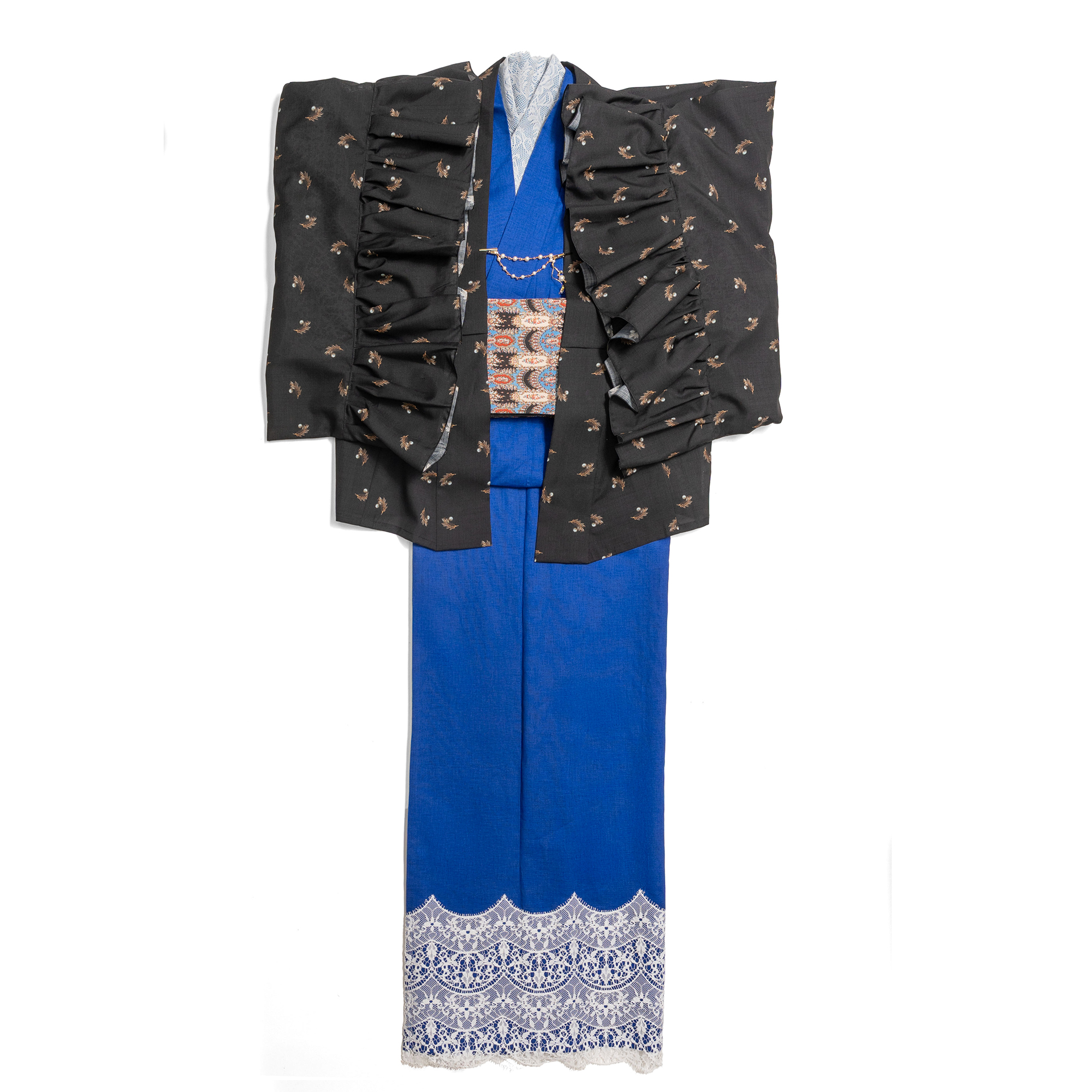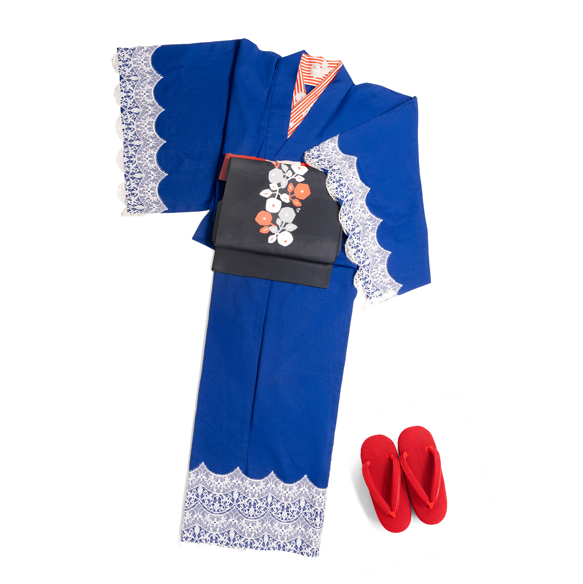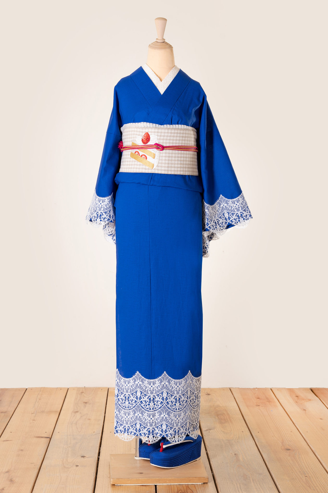 上のコーディネートでも使用したロイヤルブルーのフレームレース着物。