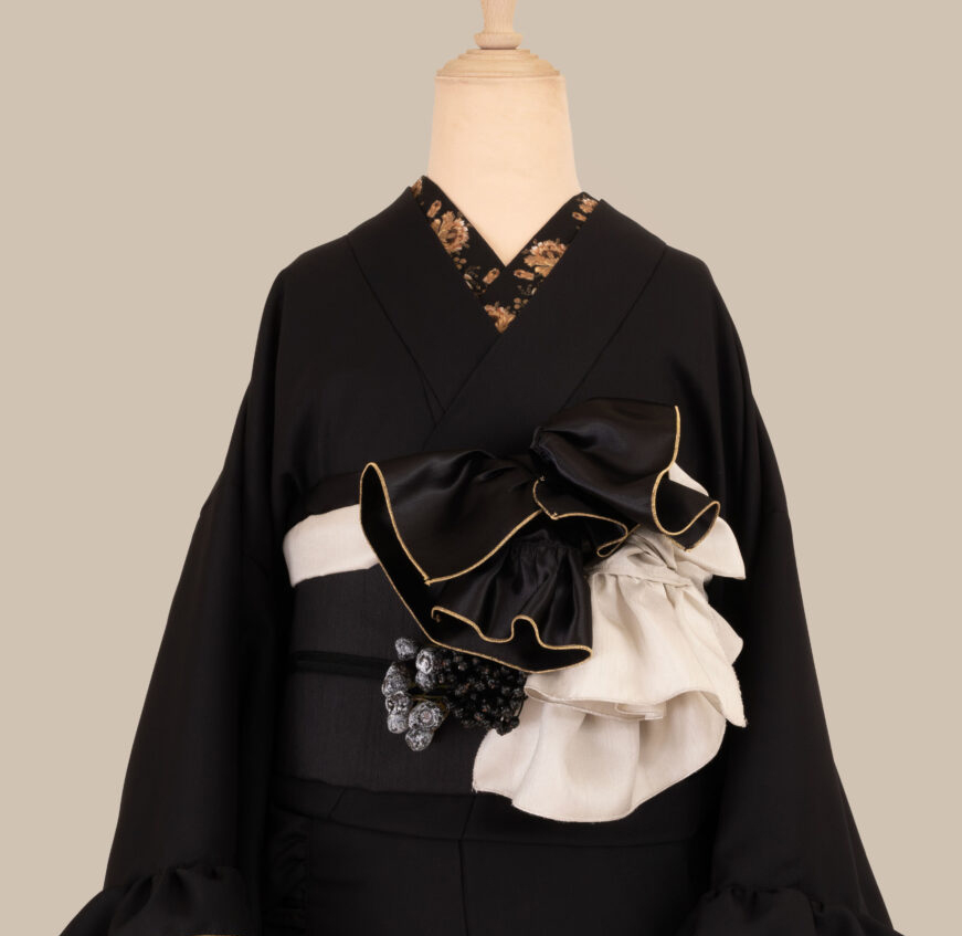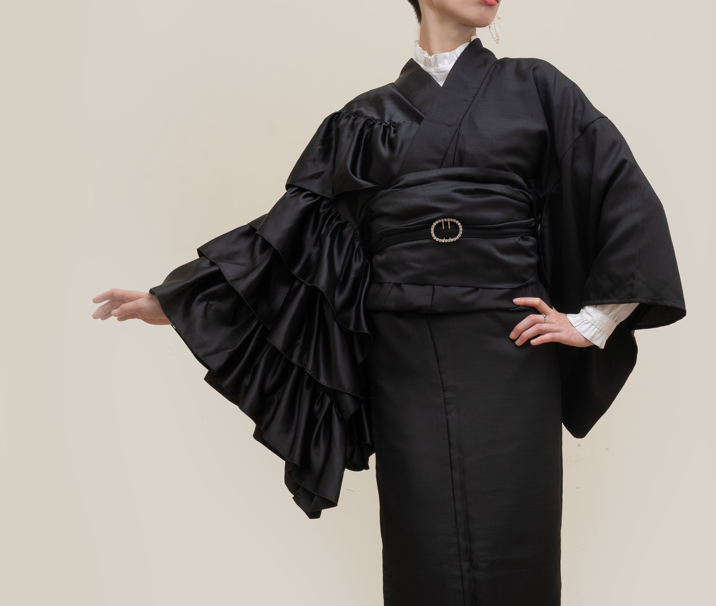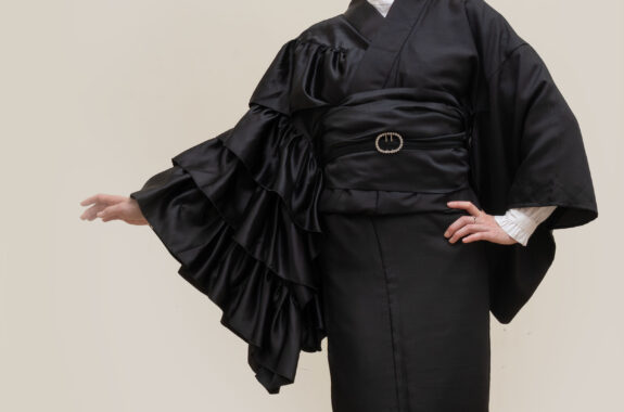 サテンのフリルがやわらかく光るモードなオールブラックの片袖フリル着物、再入荷致しました。