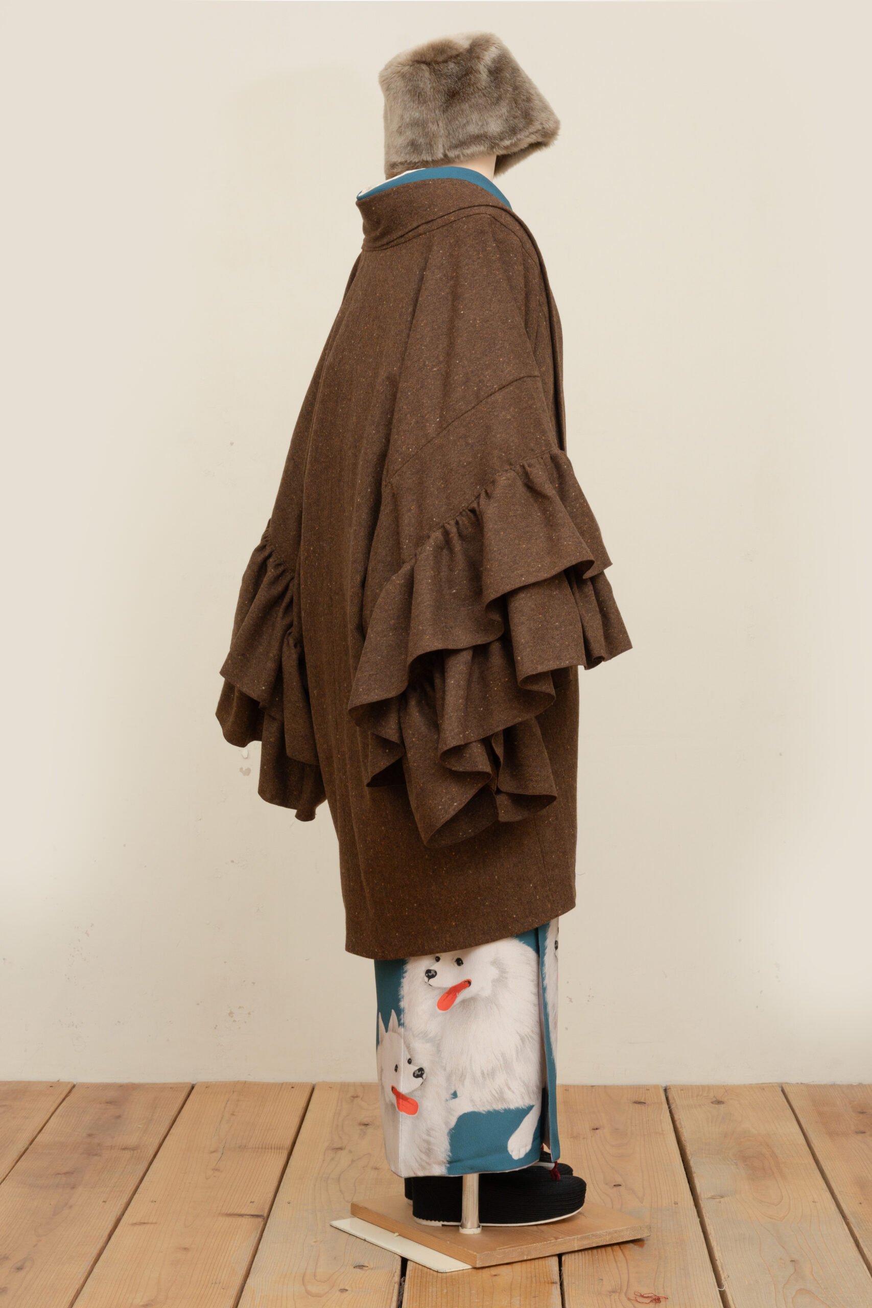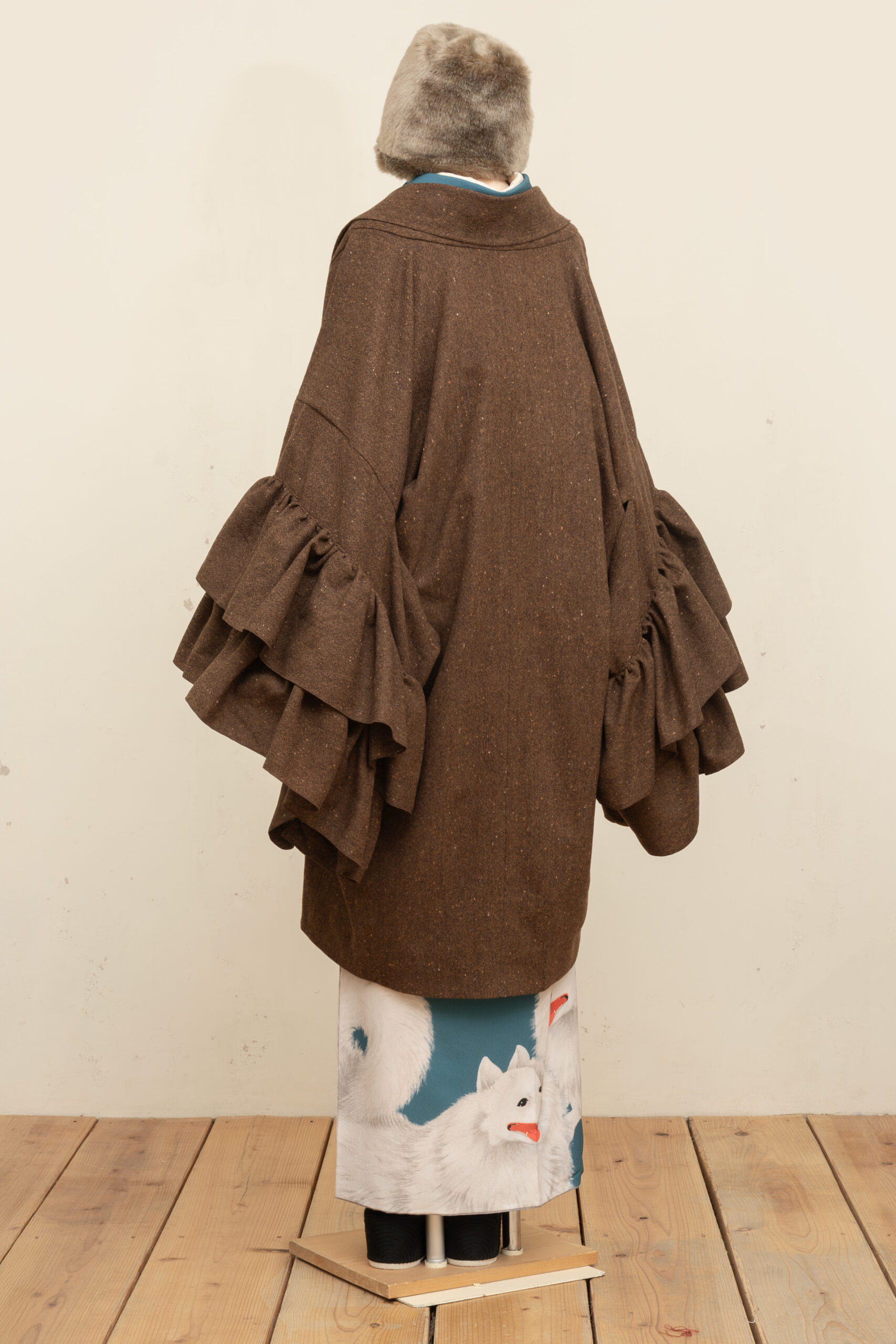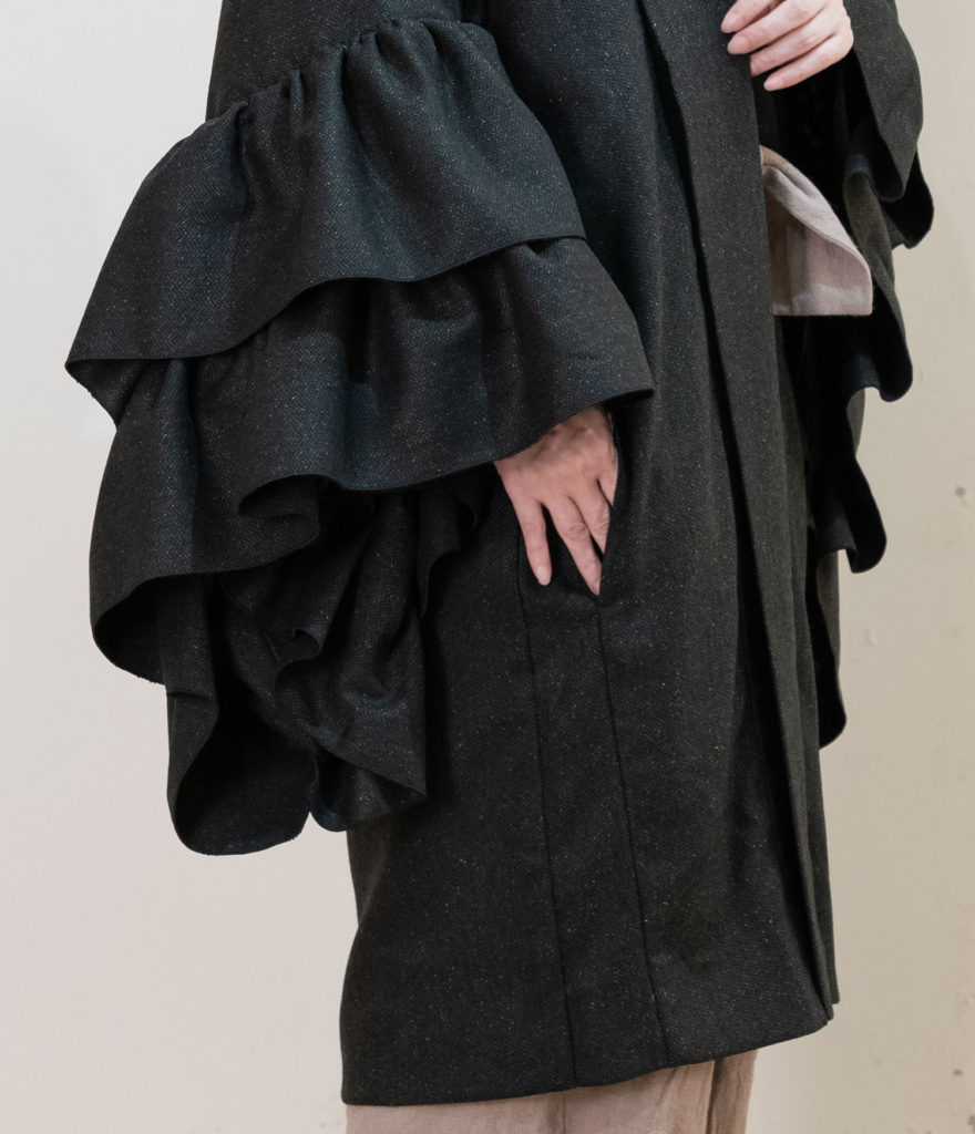 両袖にフリルを施したウール混素材の羽織コートです。