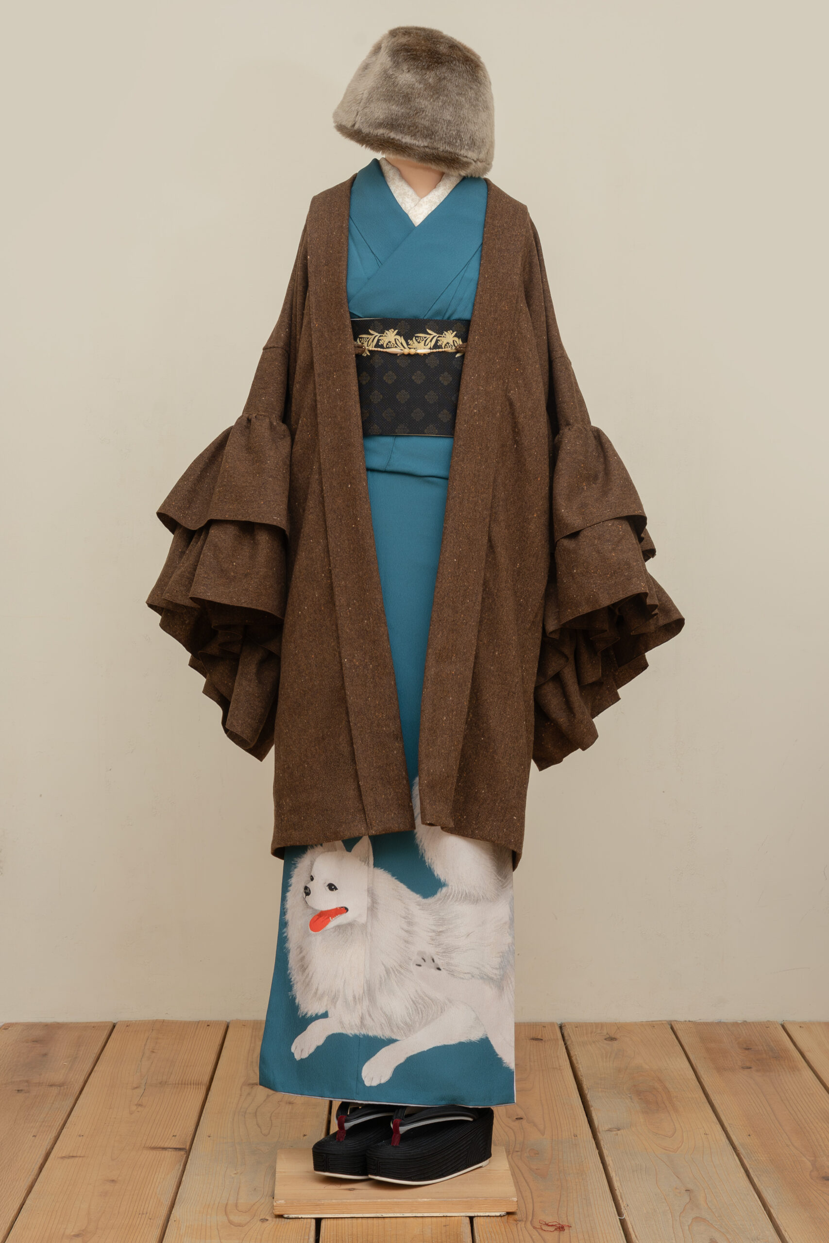羽織の型をベースに作っていますので着物のお袖もすっぽりと収まり、すっきりとしたシルエットでお召し頂けます。