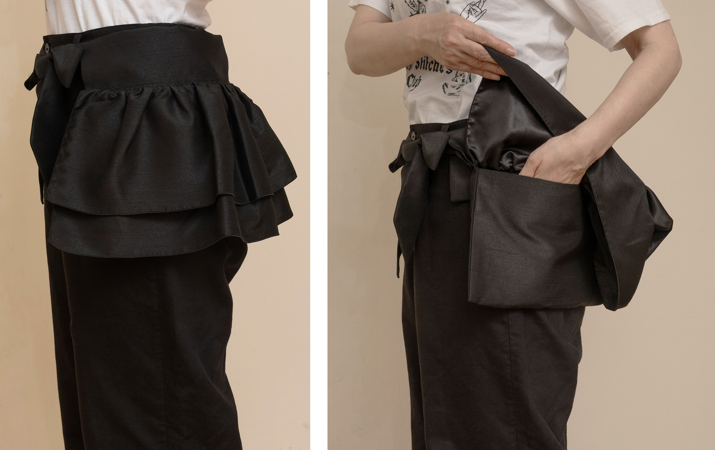 写真はベルト通しにポシェットの紐を通してポケット付きペプラムのように使ったアレンジです。
