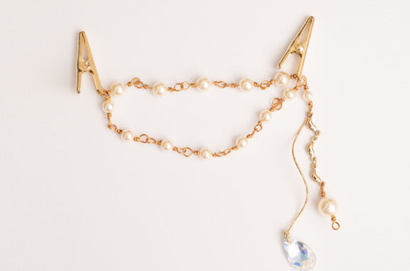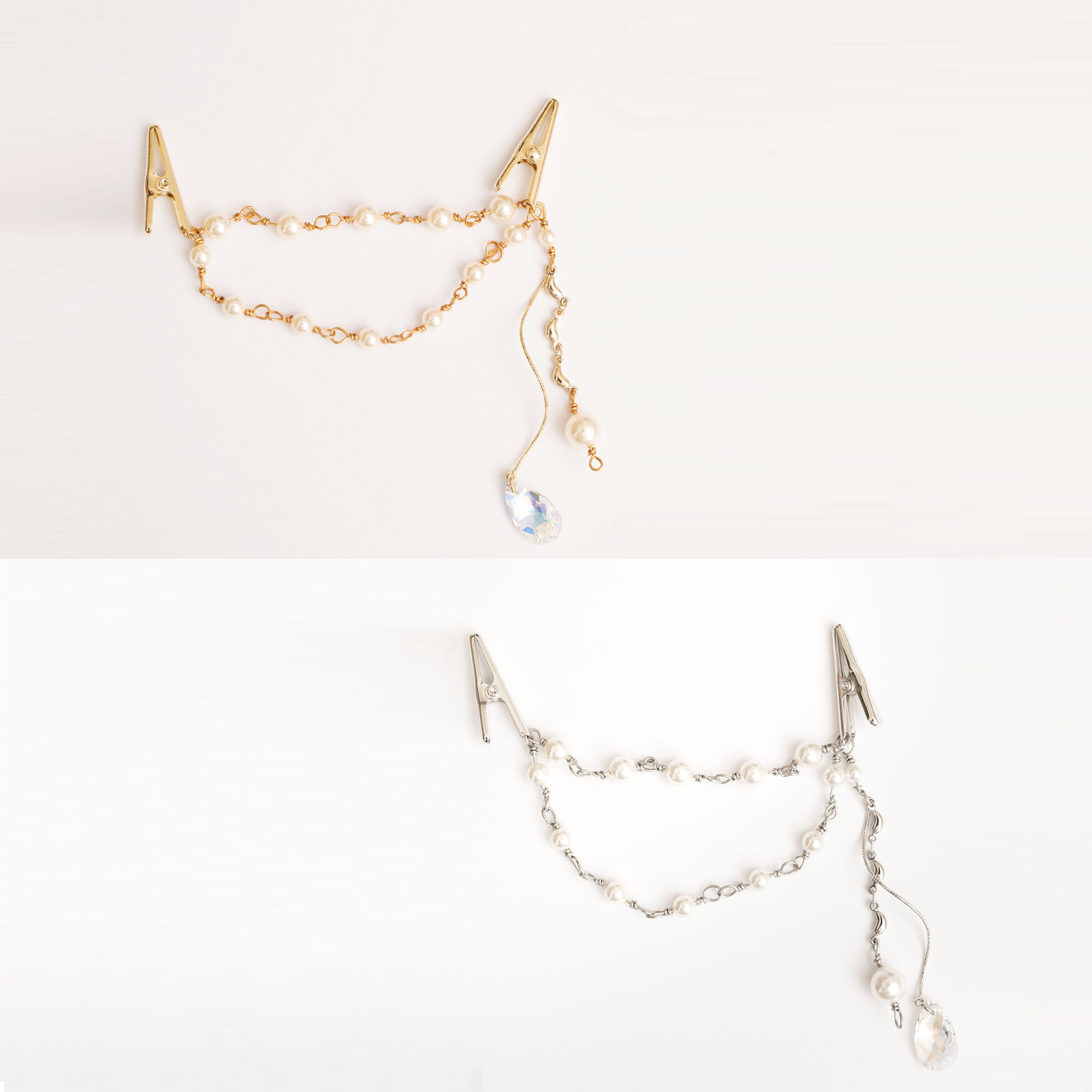 チェーンは生地に引っかかりにくいように一つずつワイヤーワークで繋げられたこだわりの仕様。