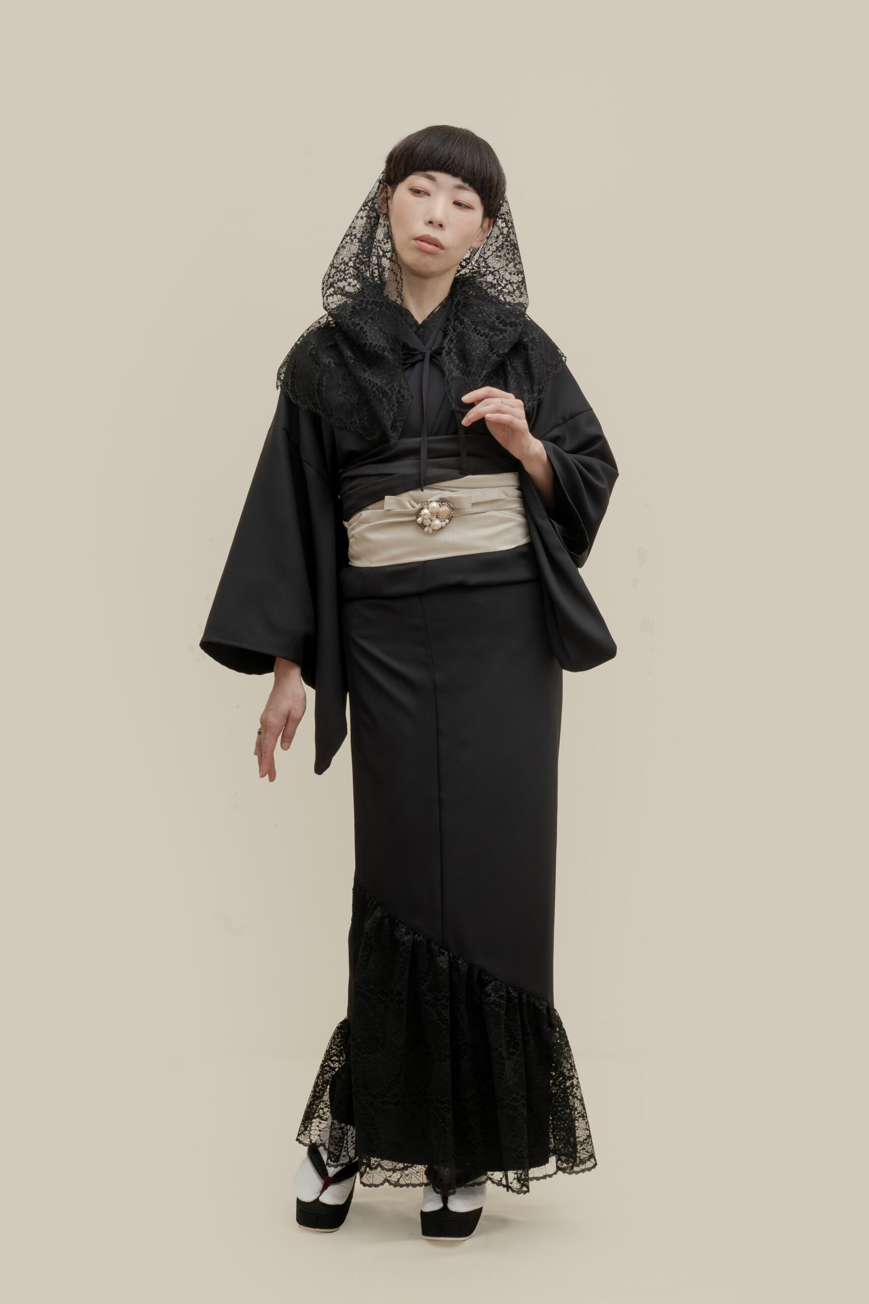 この着物には別パーツのレース飾りがセットで付いていますので、付け衿のように使ったり帯周りに添えたりと色々なアレンジでお楽しみ頂けます。