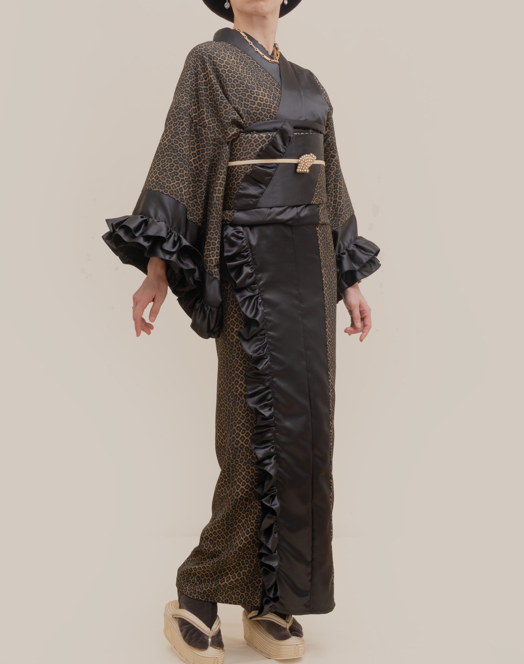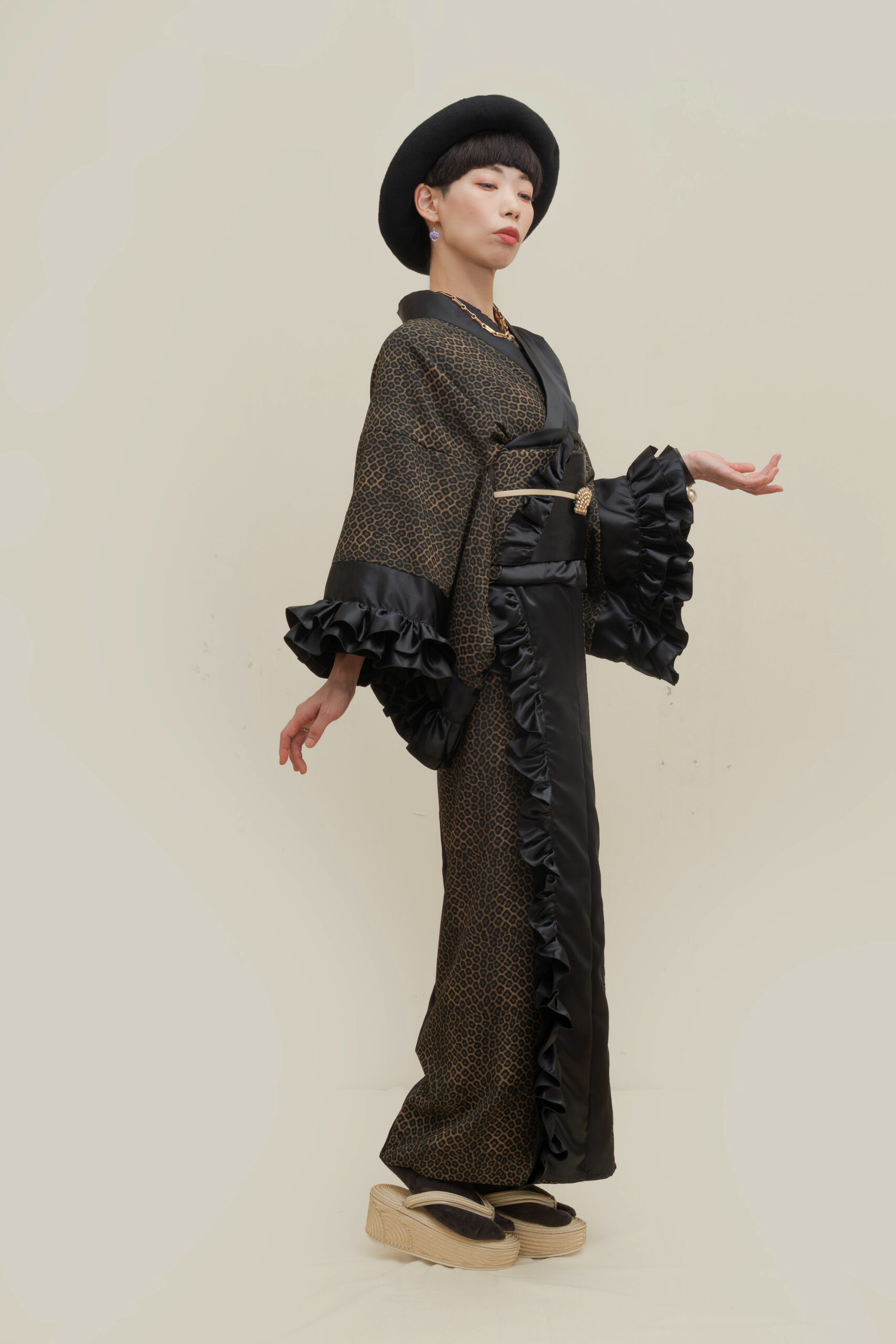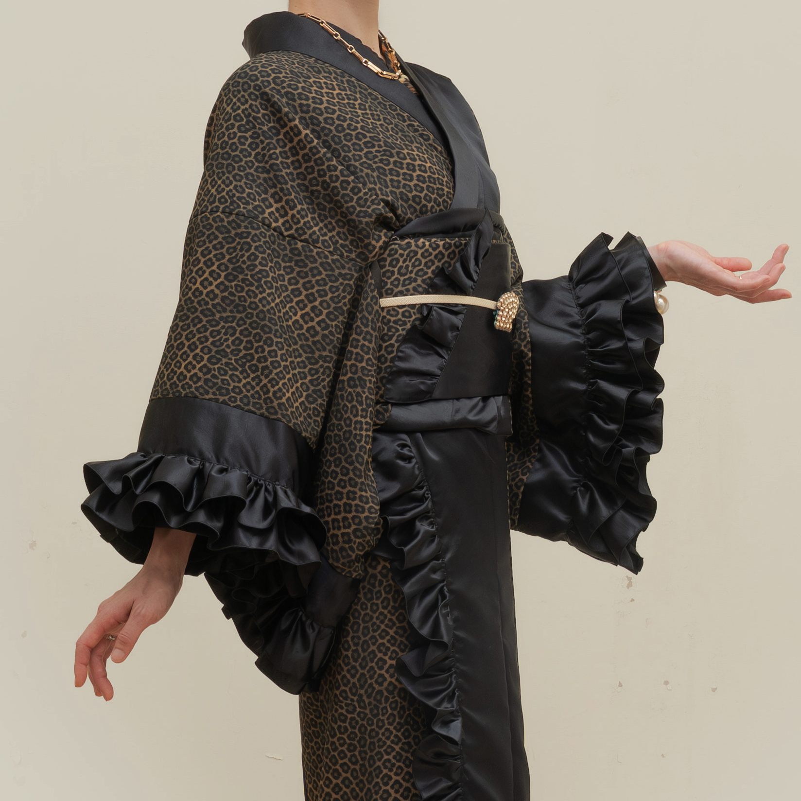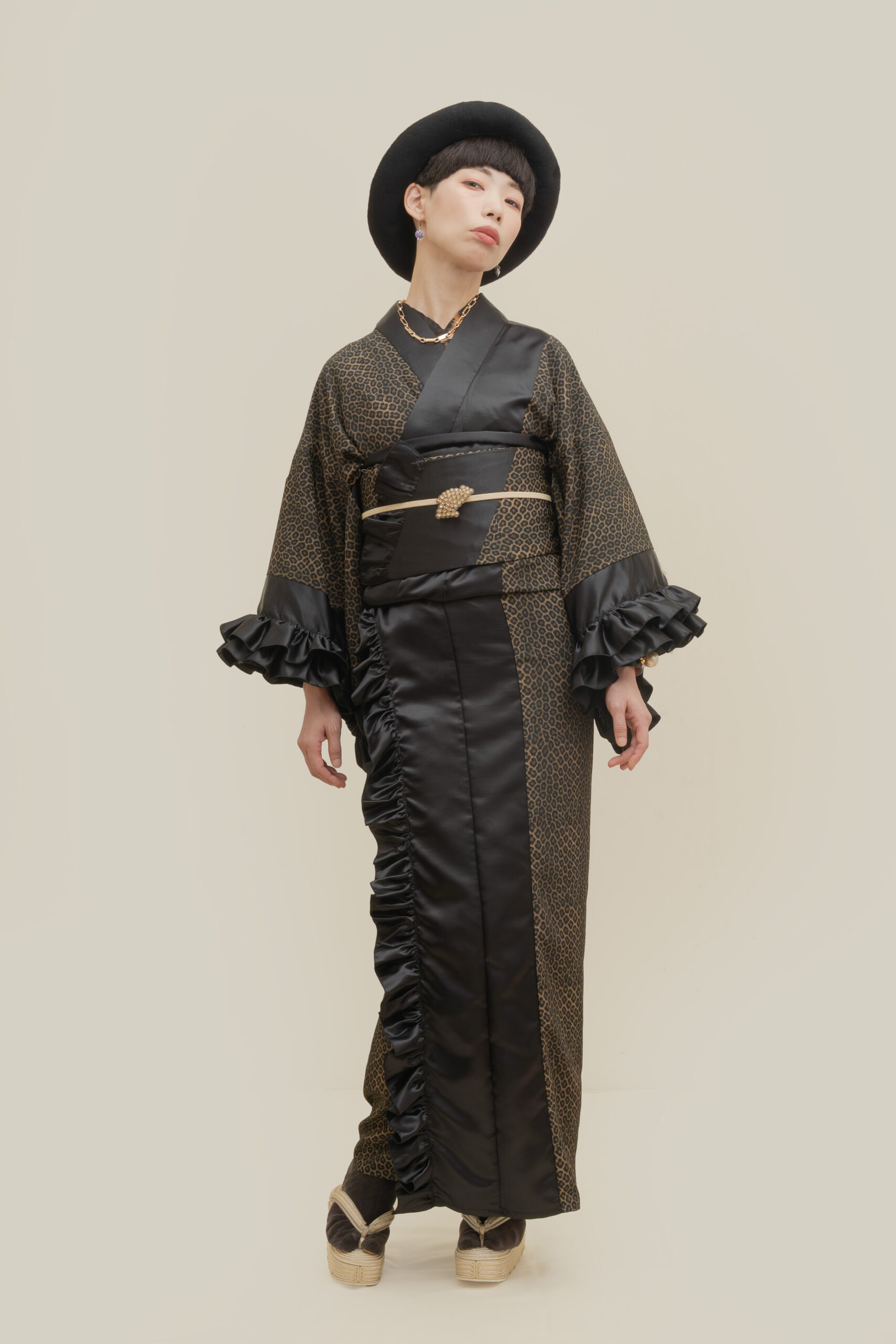 同シリーズの「半幅帯 フリル(レオパード)」を合わせると帯からおくみにかけて流れるようにフリルが配置され、ドレスのようなコーディネートをお楽しみ頂けます。
