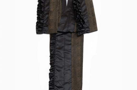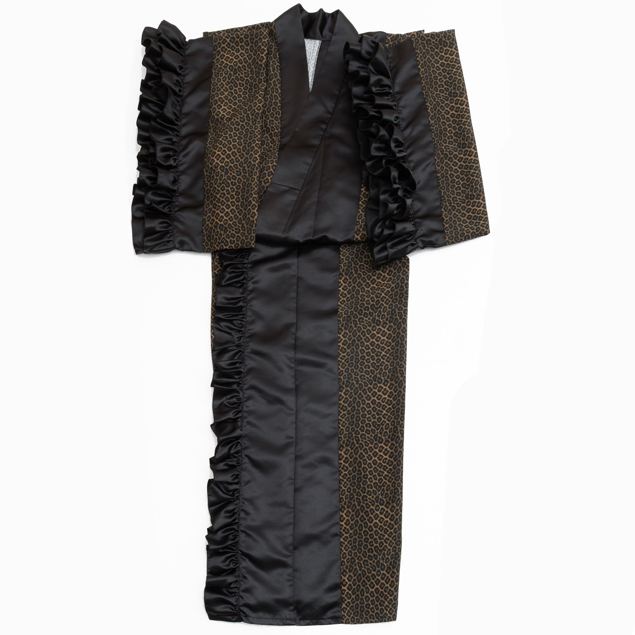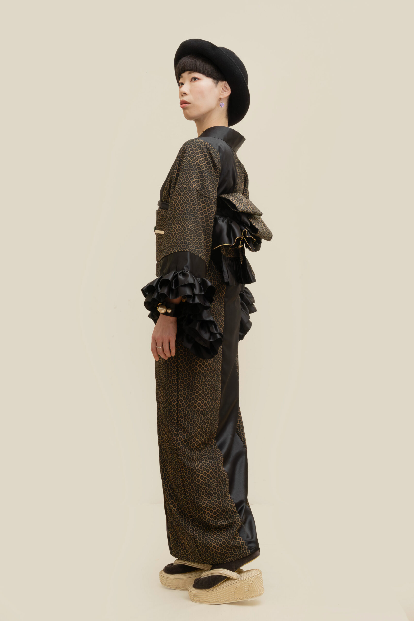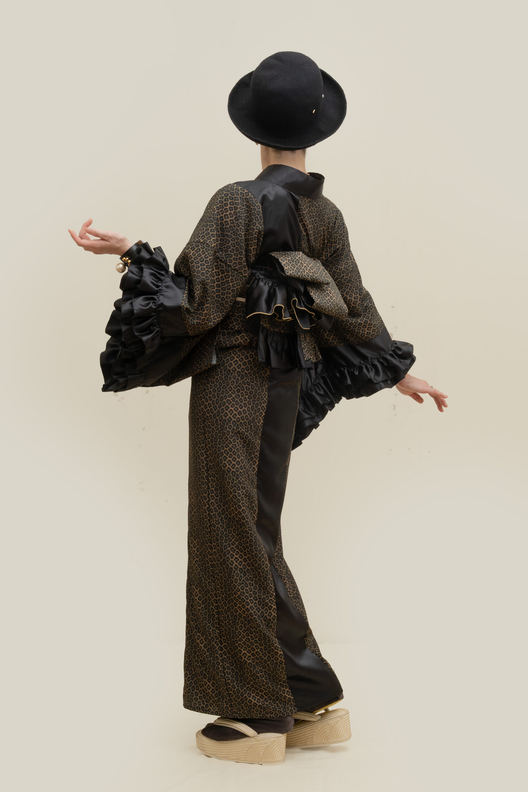 同シリーズの「半幅帯 フリル(レオパード)」を合わせると帯からおくみにかけて流れるようにフリルが配置され、ドレスのようなコーディネートをお楽しみ頂けます。