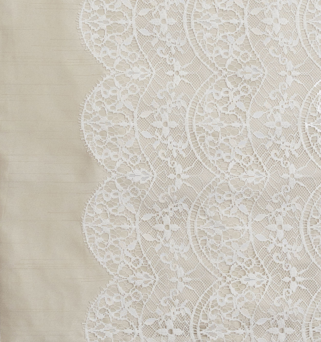 ベースのサンドベージュカラーのシャンタン素材とスカラップをいかしたホワイトのレースの組み合わせ