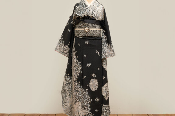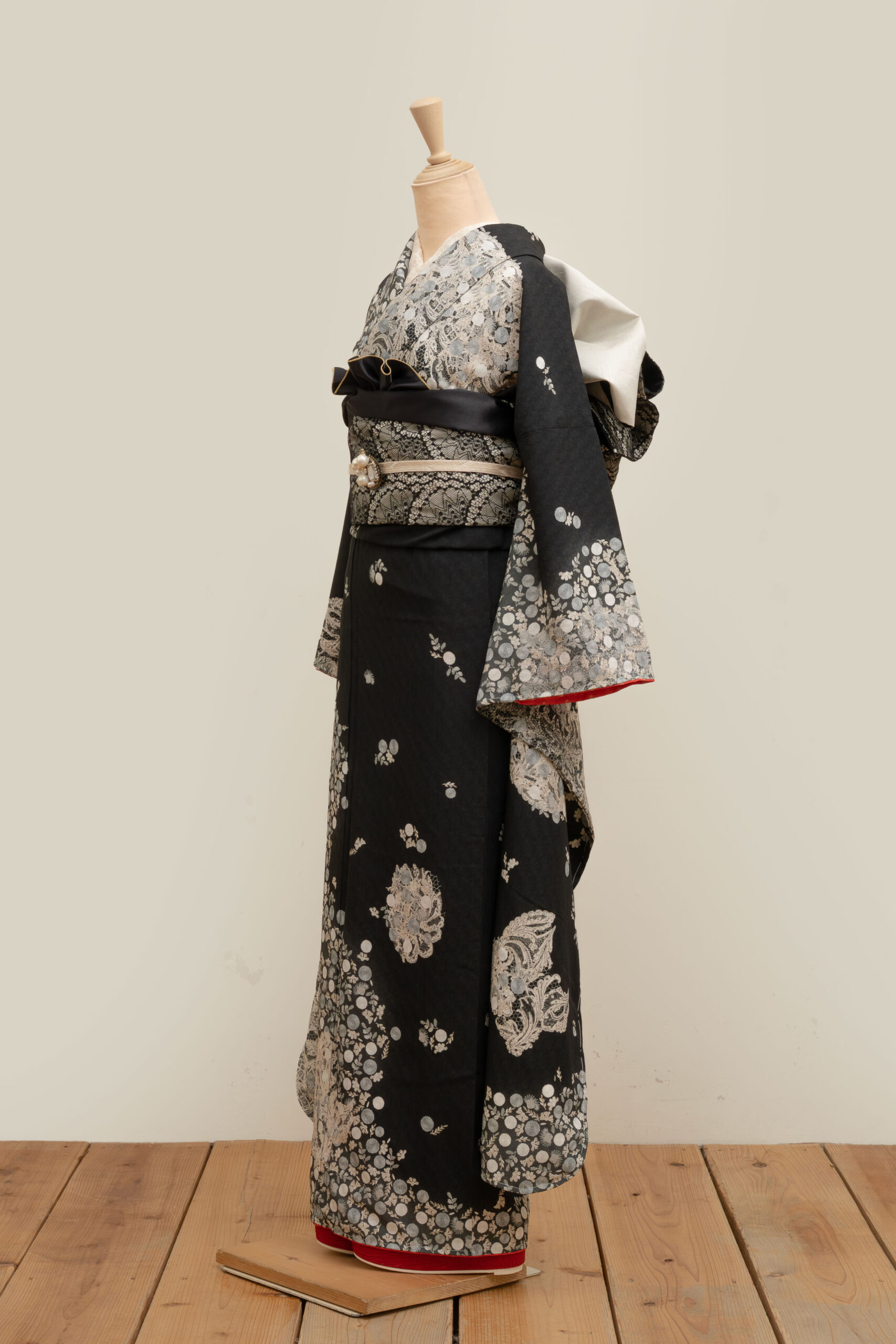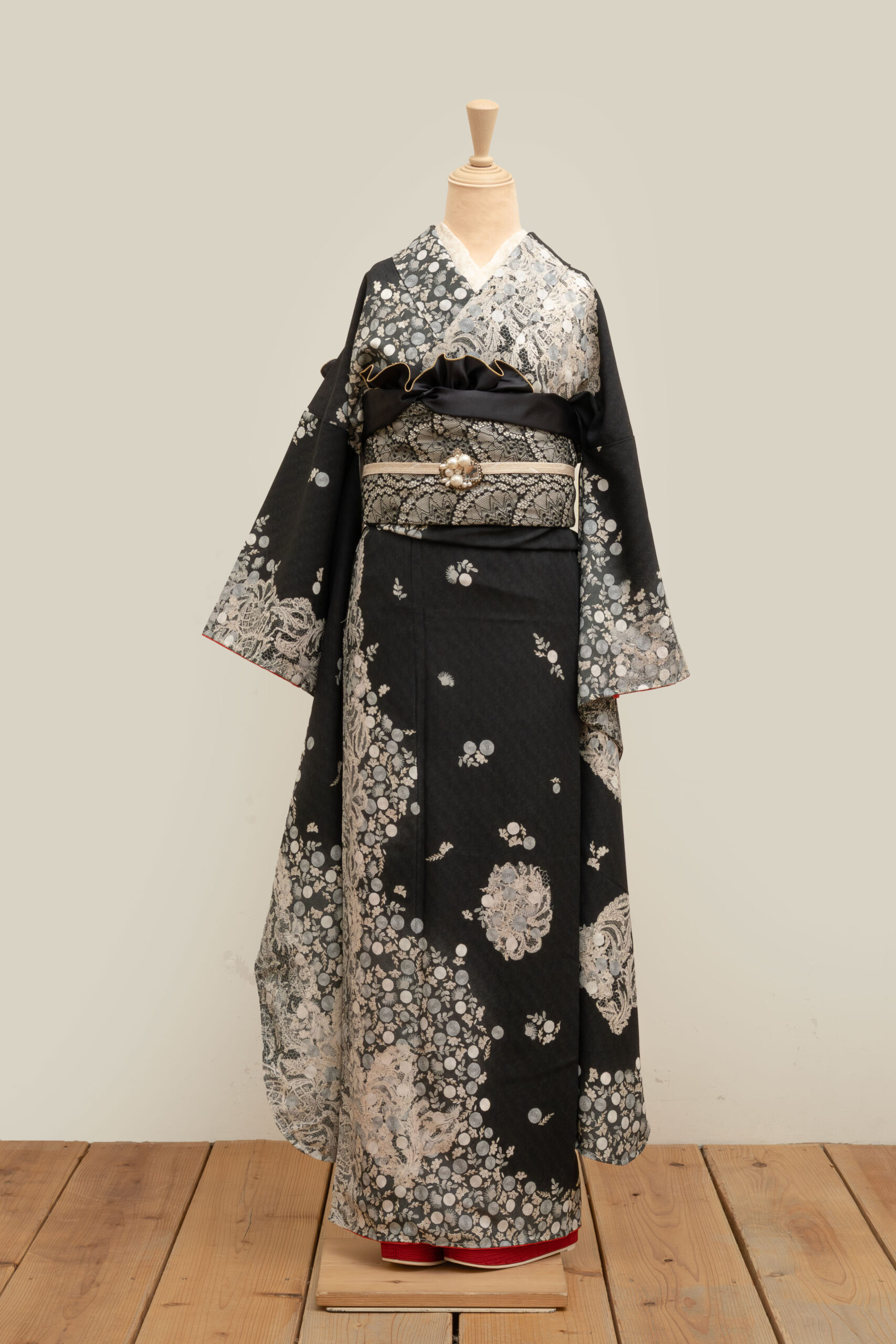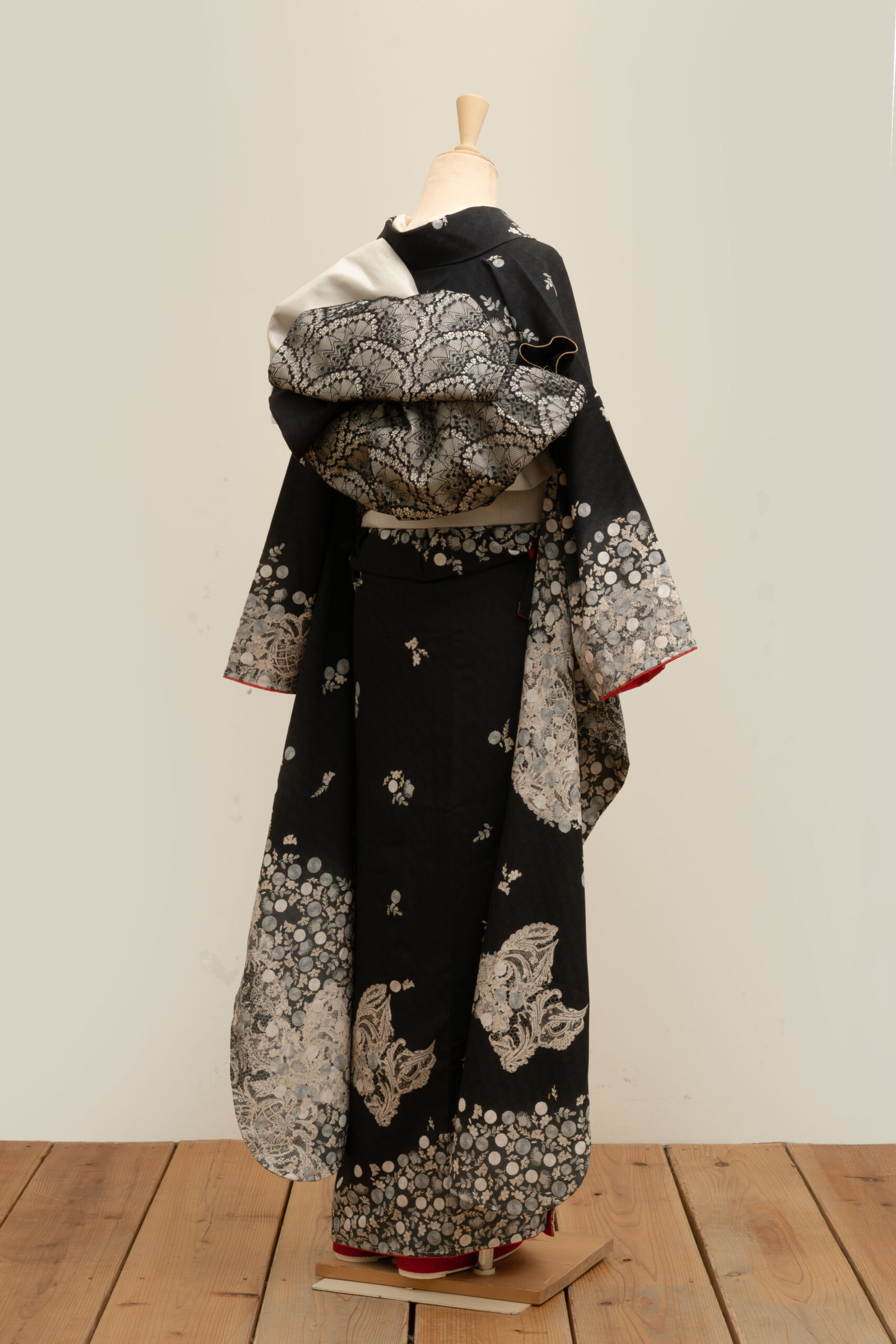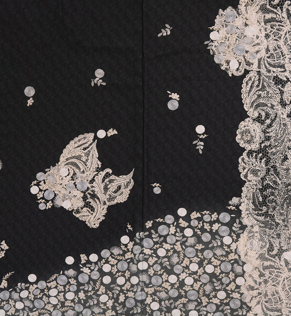 炭黒のベースと淡いトーンのモチーフのコントラストが美しいシックながらも華やかな印象