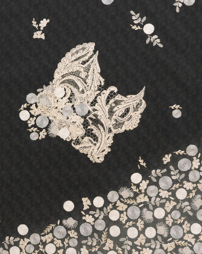 満開の花々と蝶のように舞うレースが華やかな印象の1枚。