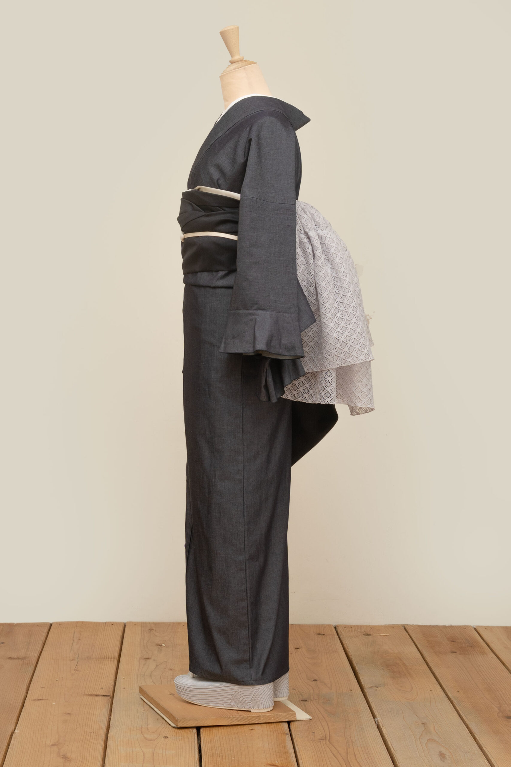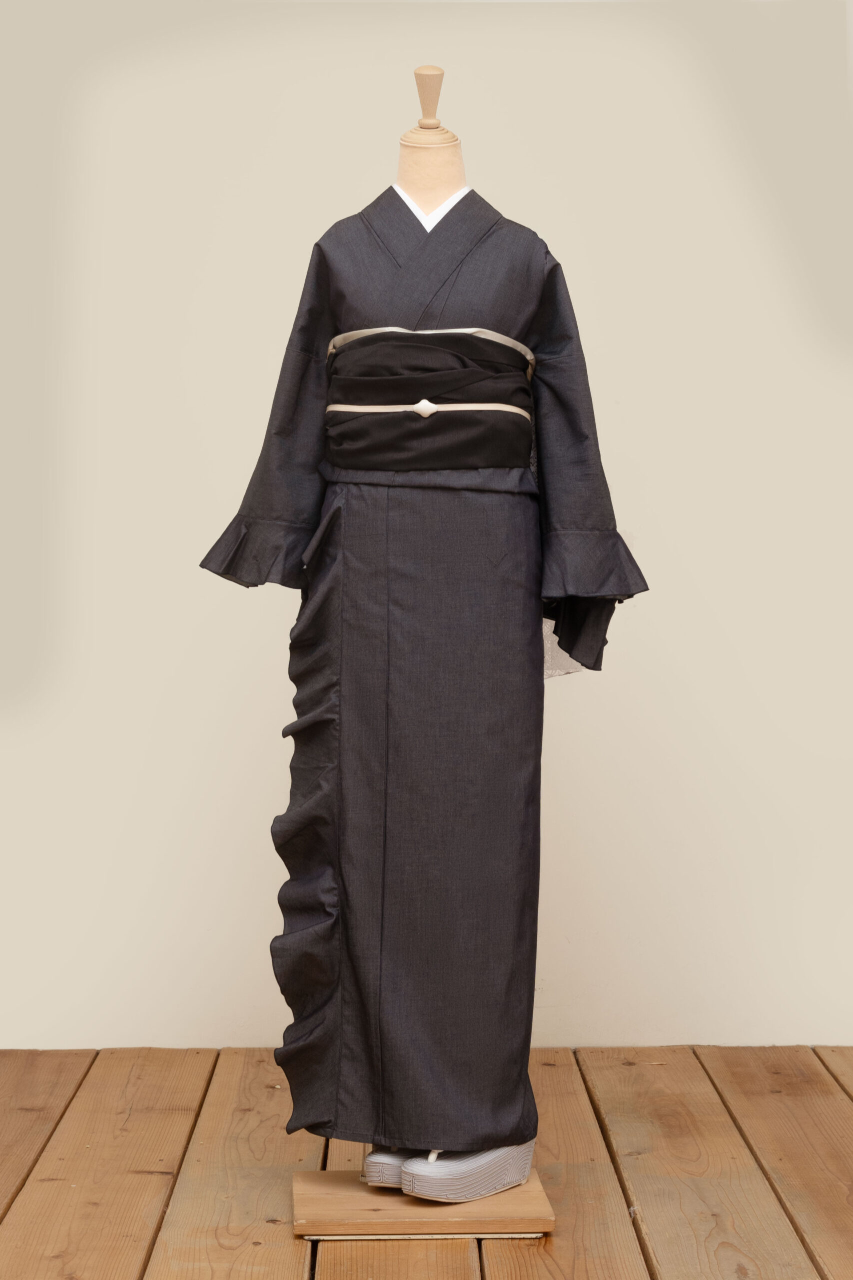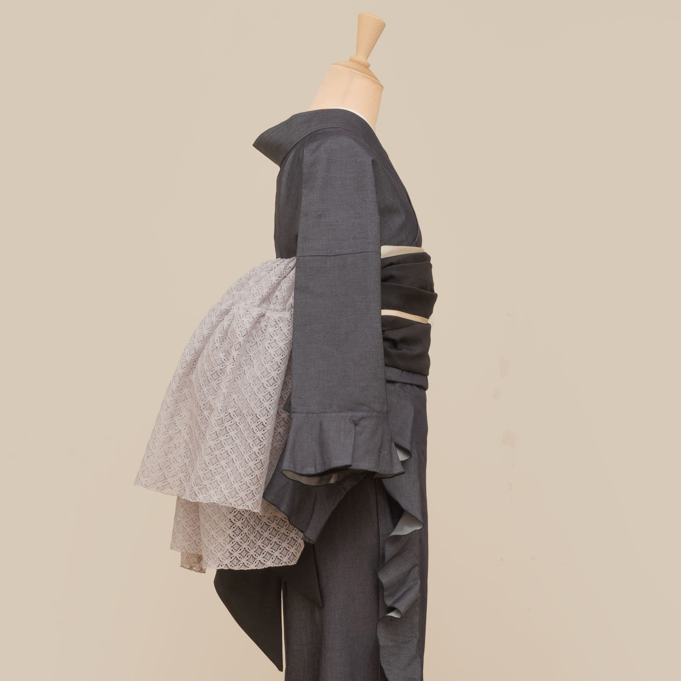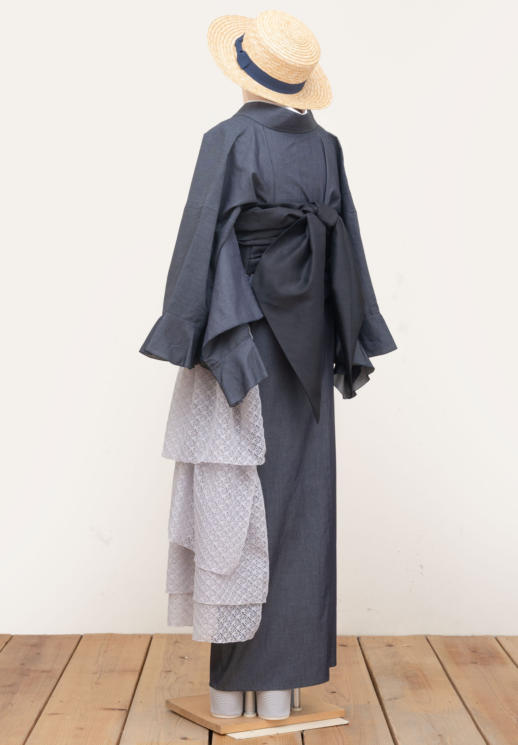 フリル部分全体の長さは約80cm。ちょうどお太鼓からたれ先部分の長さと同じくらいなので、フリルの2段目あたりからたくし上げて銀座結びのように巻くとボリューム感のある兵児帯のようなシルエットに。